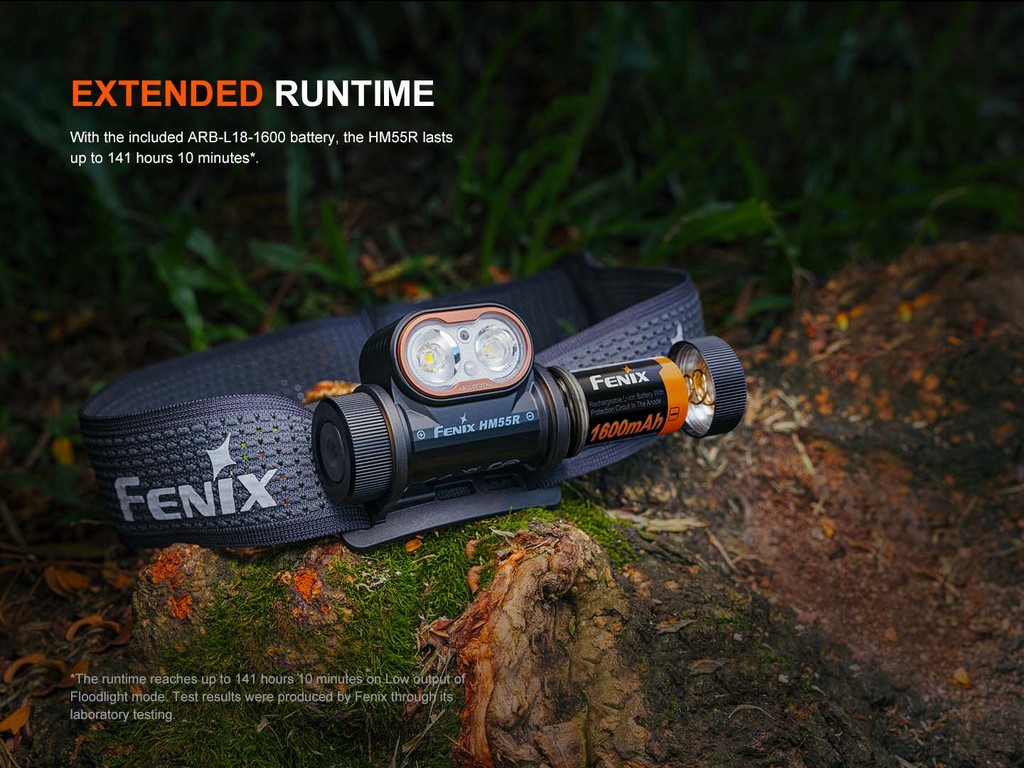 Lehká, výkonná a nekompromisně všestranná. To je nabíjecí čelovka Fenix HM55R, navržená pro každou situaci. Díky kompaktnímu Li-ion akumulátoru typu 18350 váží pouhých 105 gramů, ale její maximální výkon 1200 lumenů s dosvitem až 175 metrů vás ohromí. Nabízí tři typy svícení – dálkové, široké a červené – takže máte vždy po ruce to správné světlo, ať už prozkoumáváte terén, pracujete v dílně, nebo si jen chcete číst ve stanu. Dálkový reflektor vytváří dobře zaostřený světelný paprsek s dalekým dosvitem a druhý reflektor má světelnou stopu velmi širokou a plynulou. Světelný tok dálkového reflektoru je až 1200 lumenů, reflektor s širokým kuželem nabízí maximální výkon 350 lumenů a neutrální odstín světla s vysokým indexem kvality podání barev CRI >90 (Color Rendering Index). K dispozici je také červené světlo a blikačka o síle 5 lumenů. K napájení používá jeden Li-ion akumulátor typu 18350 s kapacitou 1600 mAh, který je součástí balení a nabíjí se přes moderní USB-C konektor přímo v čelovce. Čelovku lze v nouzi napájet také akumulátory RCR123A (16340) i jednorázovou baterií CR123A. Čelovka je opatřena širokým pohodlným popruhem. Popruh je perforovaný pro rychlý odvod potu a opatřený reflexními prvky, které zajišťují dobrou pasivní viditelnost při běhu po silnici.