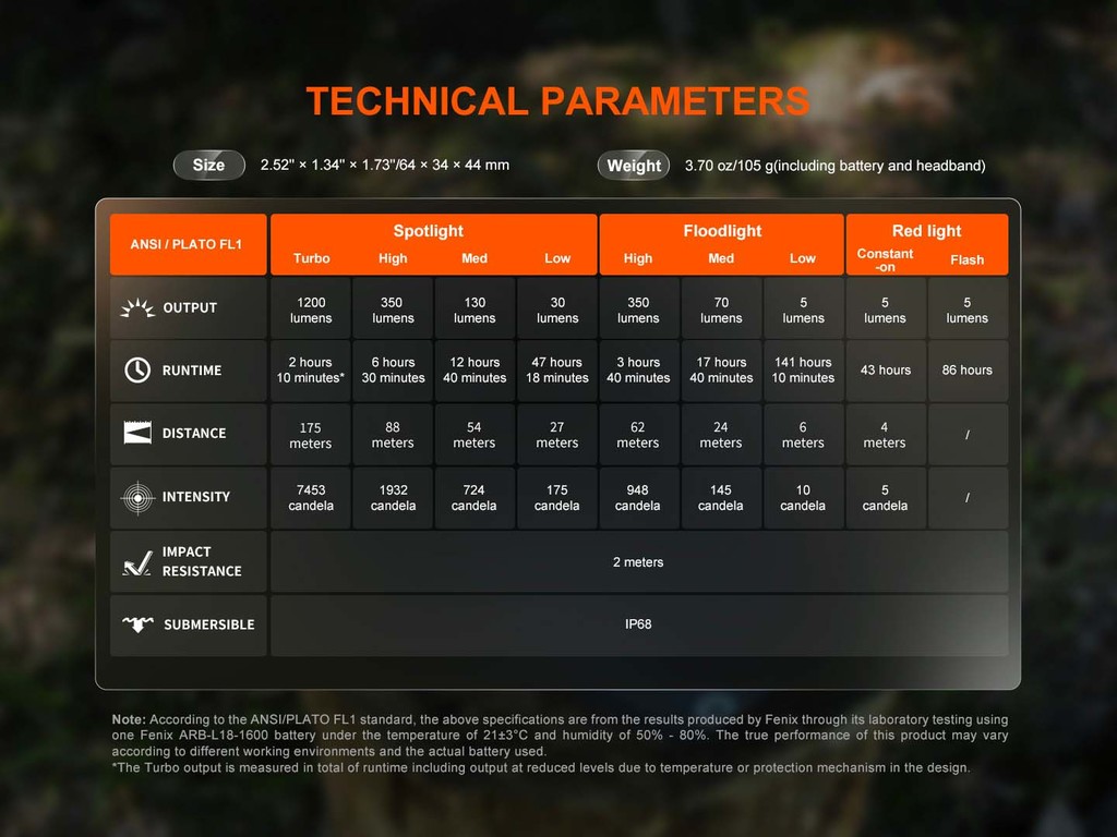 Všechny parametry čelovky (světelný tok, doba provozu na baterie, vodotěsnost, dosvit a nárazuvzdornost) jsou změřeny v souladu s normou ANSI/NEMA FL 1-2009.